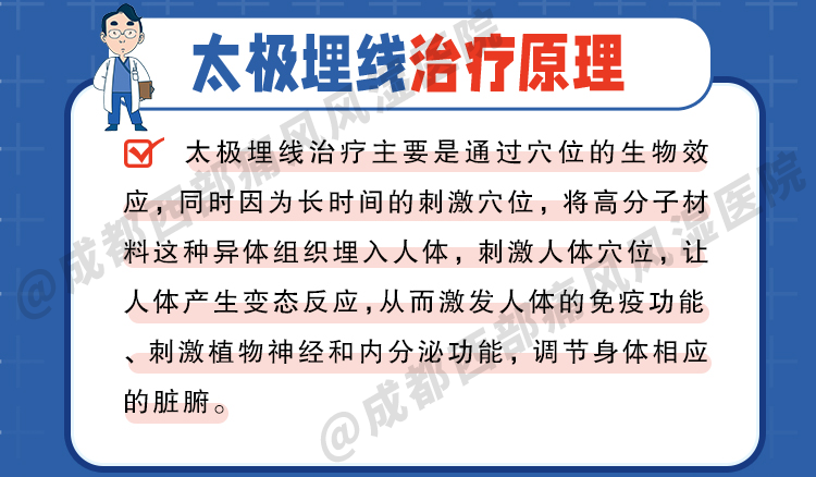 其利用对穴位的持续刺激作用进行治疗,过药线在体内的生理、物理作用及生物化学反应达到治疗风湿慢性疾病的目的。太极埋线的作用显优于单纯针灸治疗,尤其在风湿免疫性疾病治疗中广泛应用。其主要是通过刺激人体相应的穴位,从而刺激经络、调整内脏,达到治疗疾病的目的。太极埋线的适应症十分广泛,它不但适用于慢性疾病,对一些疾病的急性期也有较好疗效。