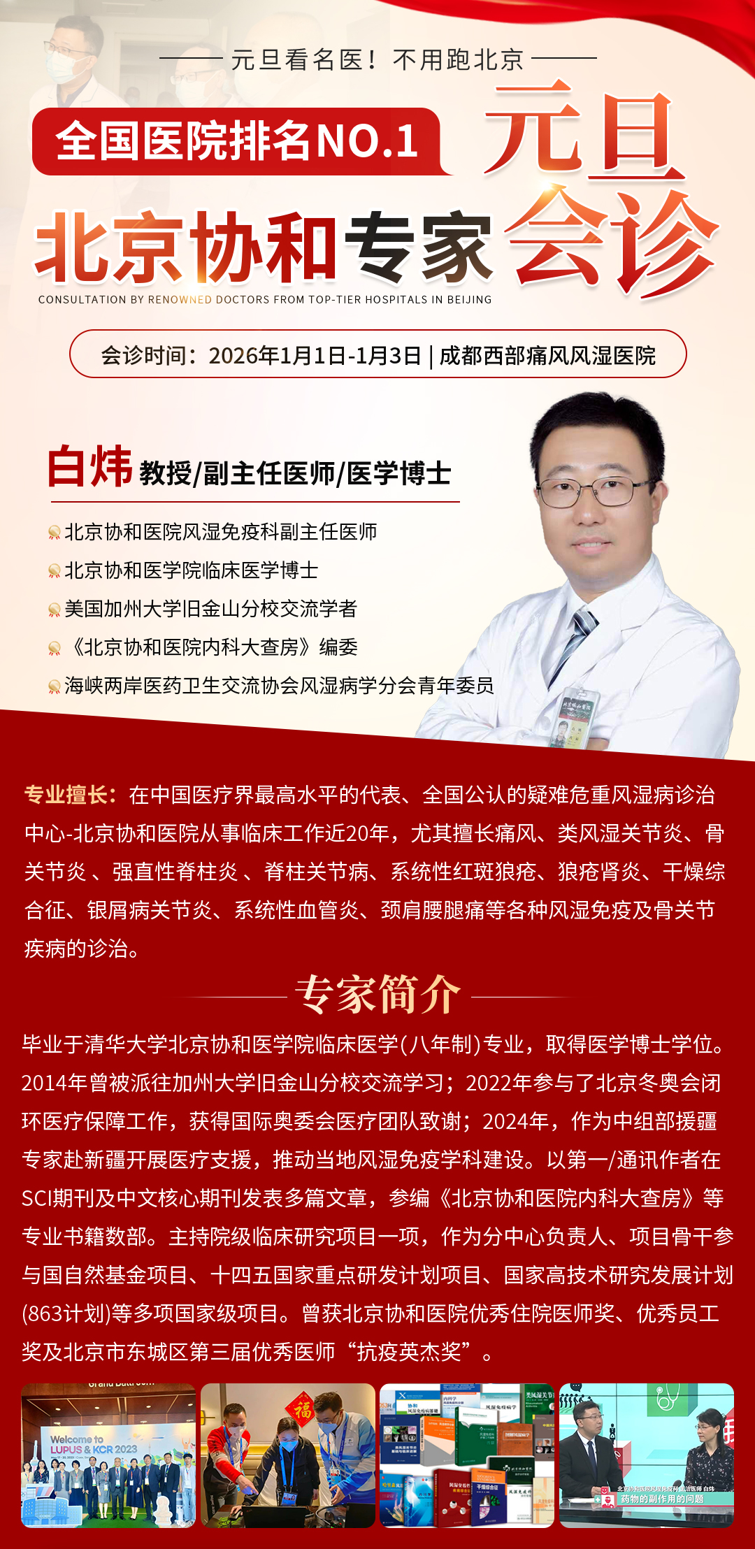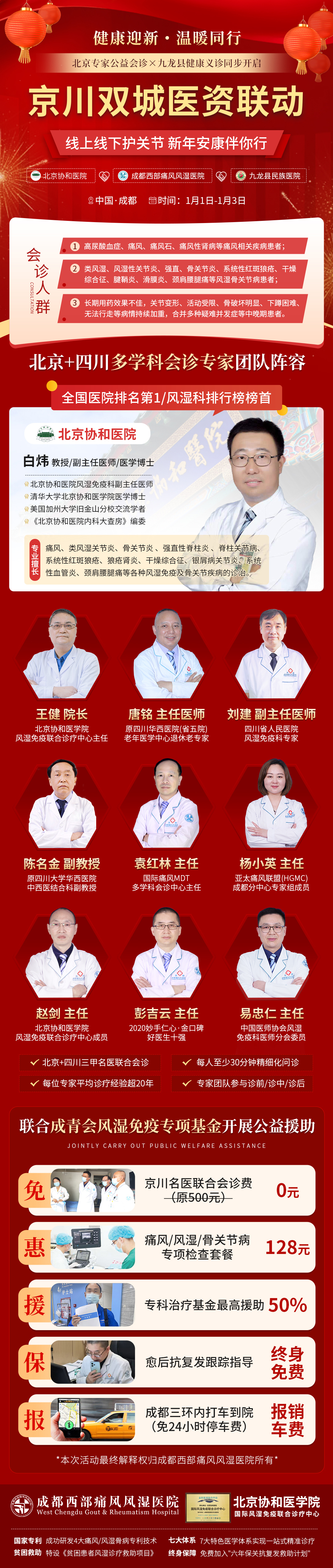 为让优质医疗资源真正触手可及,成都西部痛风风湿医院联合成青会风湿免疫专项基金,正式发起“健康迎新·温暖同行”公益行动——北京专家公益会诊与九龙县健康义诊同步启动!2026年1月1日至3日,北京协和医院风湿免疫科白炜教授将亲临成都,领衔京川专家团队开展公益会诊。与此同时,我院专家团队将深入甘孜州九龙县开展实地义诊,真正实现“专家资源下沉、健康服务上门”的双轨健康守护。