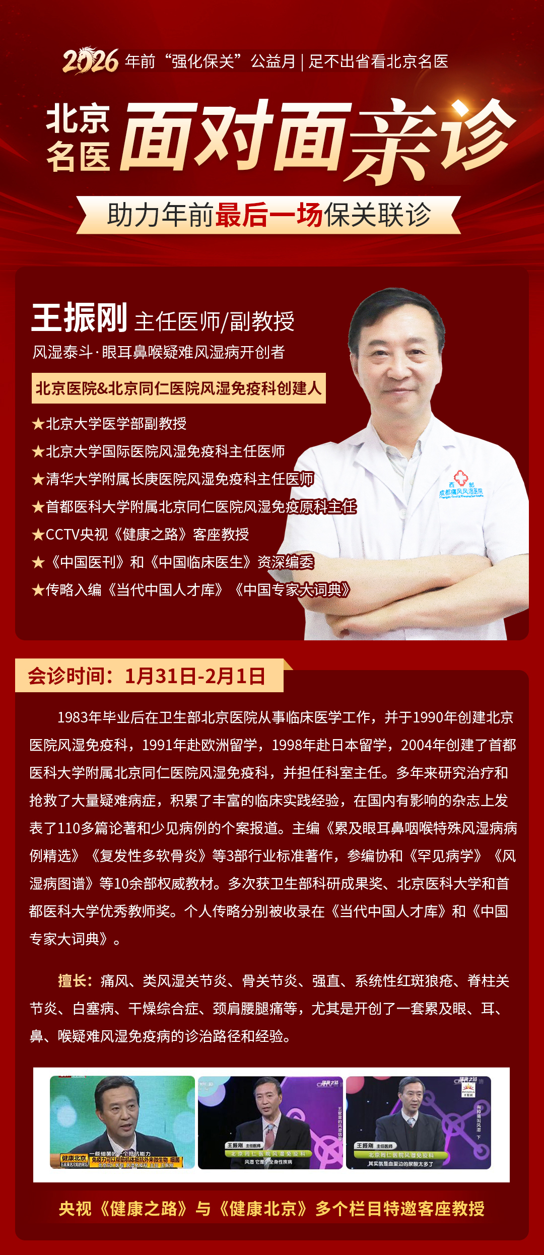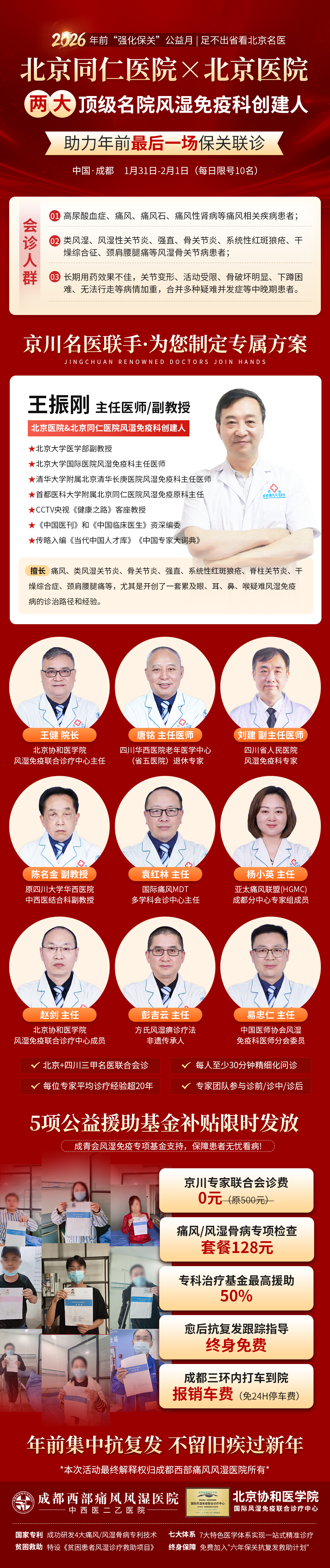 现在,不用千里奔赴北京,家门口就能看国内顶级专家!2026年前「强化保关」公益月活动现已进入倒计时,北京同仁医院&北京医院两大顶级名院风湿免疫科创建人王振刚教授领衔京川名医团,于1月31日- 2月1日亲临成都西部痛风风湿医院,带来年前最后一场保关联诊。