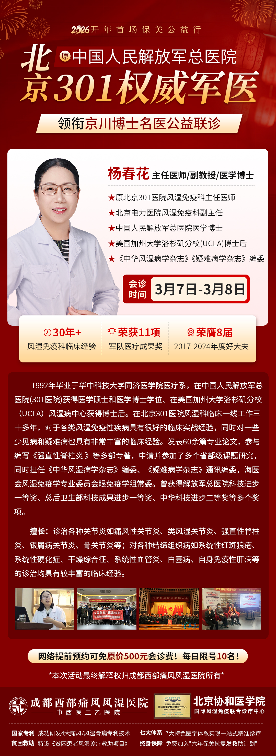 年后是痛风、风湿骨关节病的诊疗黄金窗口期。早干预、早治疗,才能有效阻断病情进展,避免关节变形、脏器损伤。本次联诊每日会诊名额有限,先预约先得,避免现场排队无号。