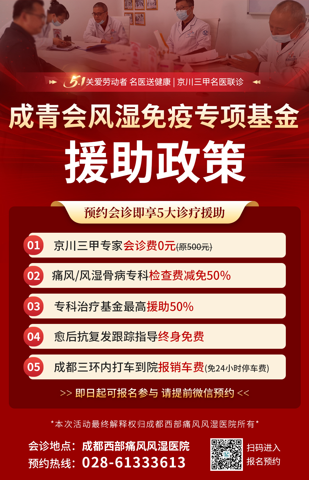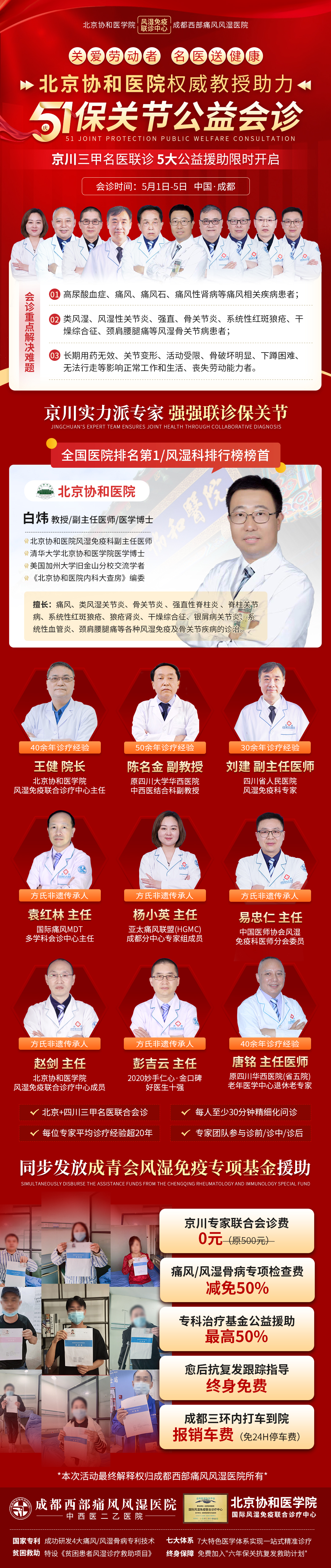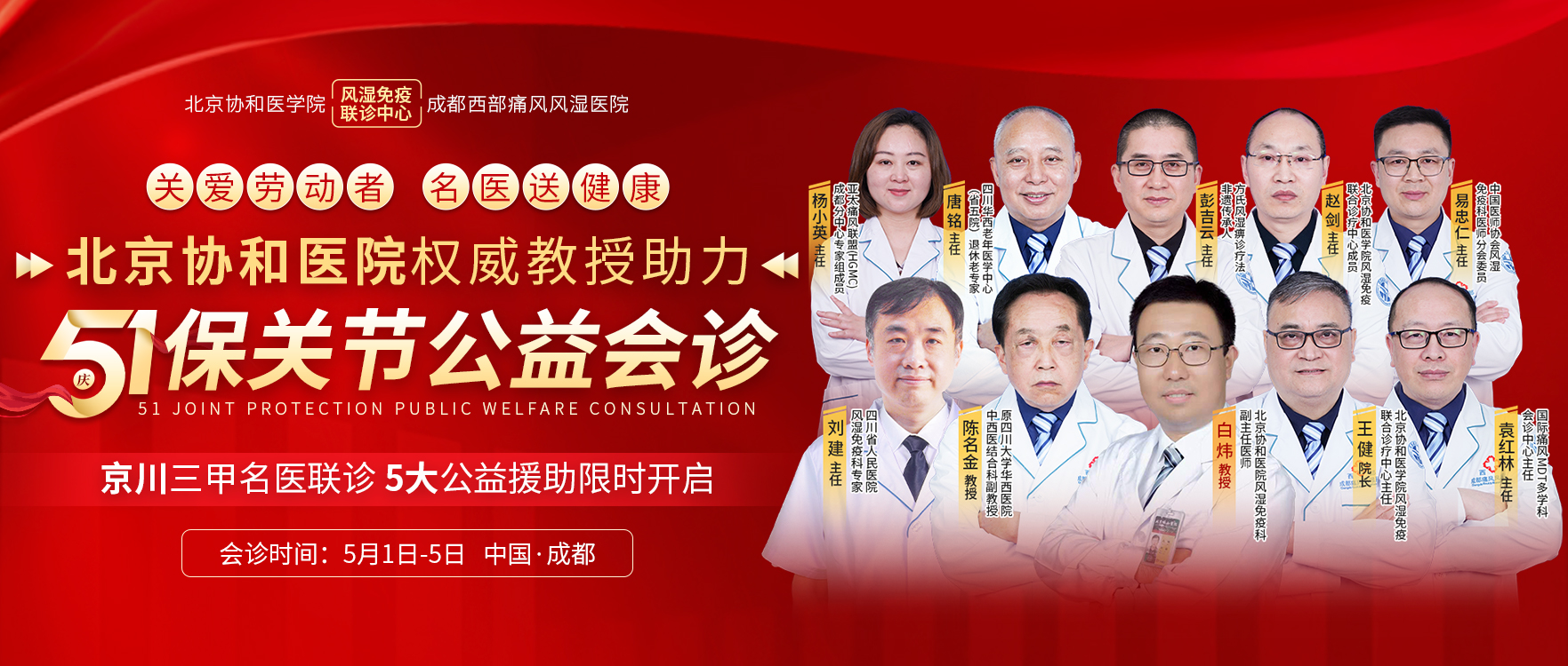 为守护劳动者关节健康,让每一位痛风/风湿骨病患者都能得到国内顶尖专家的精准诊疗。5月1日-5日,北京协和医学院风湿免疫联合诊疗中心携手成都西部痛风风湿医院,正式启动「关爱劳动者 名医送健康」5·1 保关节公益会诊!